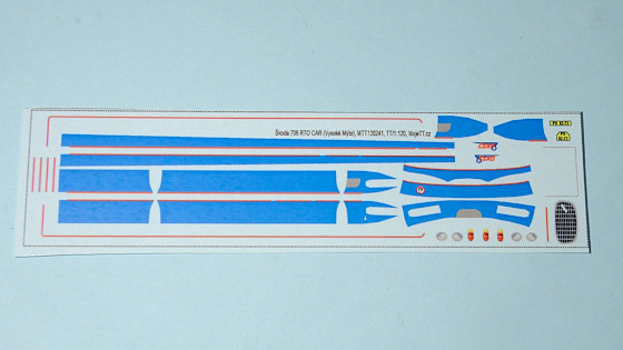 Obsahuje vše potřebné pro obtisknutí bíle nastříkaného modelu včetně obtisku na nárazníky. Po osazení obtisků je vhodné černou barvou natřít gumy na předním a zadním nárazníku a výfuk. Pod přední SPZ je třeba vytvořit opět bílý podklad (například natřít bílou barvou po obtisknutí žlutého nárazníku).