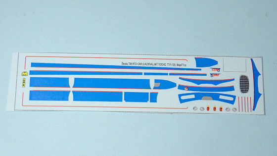Obsahuje vše potřebné pro obtisknutí bíle nastříkaného modelu včetně obtisku na nárazníky. Po osazení obtisků je vhodné černou barvou natřít gumy na předním a zadním nárazníku a výfuk. Pod přední SPZ je třeba vytvořit opět bílý podklad (například natřít bílou barvou po obtisknutí žlutého nárazníku).