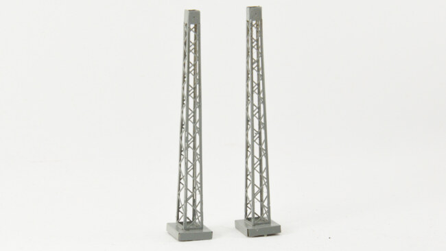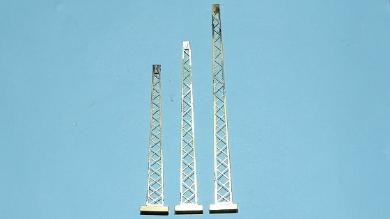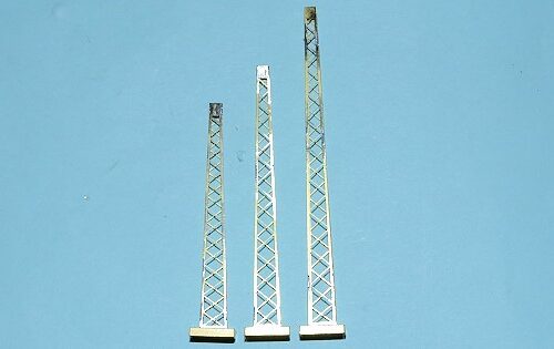Leptaná stavebnice 6 ks příhradových stožárů „BP“ pro trakční vedení nebo jiné použití. Zvolte výšku 7,5, 9 nebo 11 metrů. Rozměry dle výrobní dokumentace. Výška cca 65 mm pro 7,5m variantu, 75 mm pro 9m variantu, 94 mm pro 11m variantu.