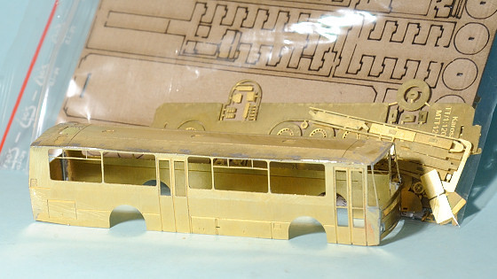 Jedná se již o spájenou skříň. Zbytek dílů je přiložen v nesloženém stavu – nárazníky, střešní doplňky, zrcátka a další drobnosti pro osazení na skříň, dále nesložený interiér a kola. Je možno objednat jako dodatečný díl odlitá kola a velkou sadu obtisků a další příslušenství stejně jako u běžné stavebnice.