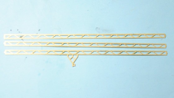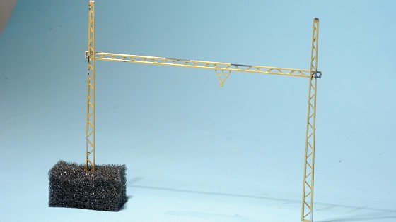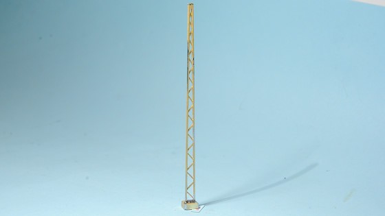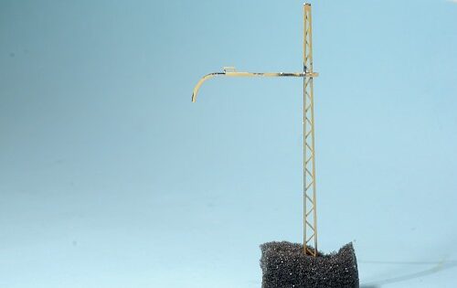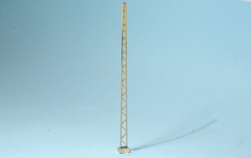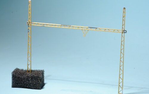 Leptaná stavebnice 8 ks starých příhradových stožárů pro trakční vedení. Výška cca 80 mm. Součástí jsou i držáky (4x krátké rovné a 4x dlouhé se zahnutím na konci) a 1 dvoukolejné břevno – délka 90 cm.