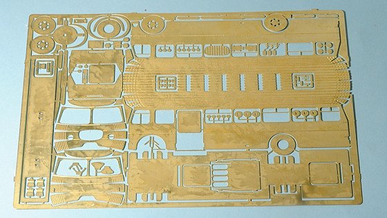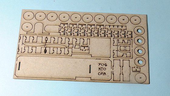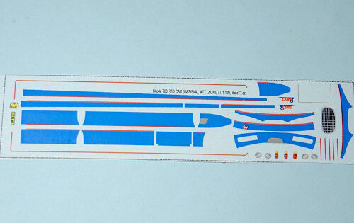 Leptaná stavebnice linkového autobusu Škoda 706 RTO CAR včetně obtisků a interiéru. Jedná se o verzi se čtyřdílnými, pneumaticky ovládanými dveřmi. Stavebnice obsahuje vše potřebné – lept karosérie, lept rámu, kola řešená vrstvením leptaných a kartonových dílů, interiér řezaný laserem do kartonu a obtisky. Součástí kompletní zasklení celého autobusu – přesně řezané boční fólie a čelní tvarovaná skla. Obtisky obsahují základní univerzální motivy (světla, SPZ, loga ČSAD a další drobnosti). Je možno objednat přímo z rozvinovacího menu variantu obtiskových pruhů. Velká sada obsahuje modré pruhy a také vše z malé sady obtisků.
