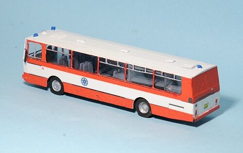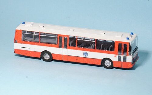 Historie: Úprav na hasičscké speciály existuje větší množství, od prostého hasičského nátěru a osazení majáků na střechu, až po úpravu představující tuto stavebnici. Úprava spočívá v zaplechování zadního okna, osazení majáků na střechu a čelo a v jiném provedení interiéru – v přední části slouží autobus pro přepravu sedících (pohodlnější dálkové sedačky + stolky), v zadní části je vůz vybaven kuchyňkou, skříňkami a 4 postelemi (2×2 nad sebou) pro nouzové ubytování hasičů. Konkrétní předloha byla v provozu u hasičů ČD.