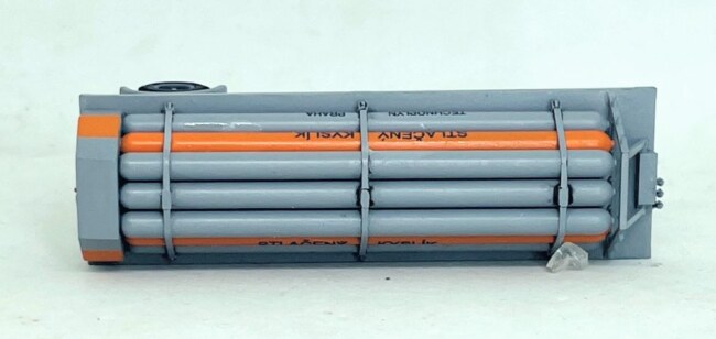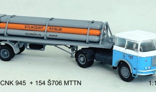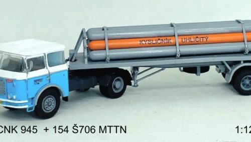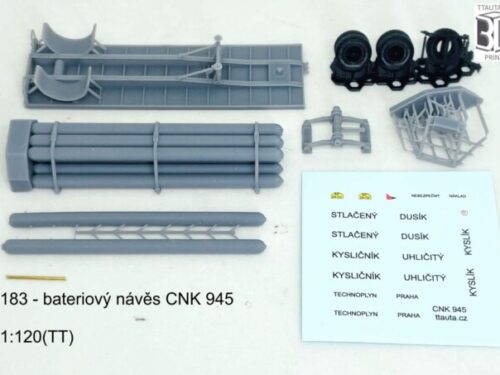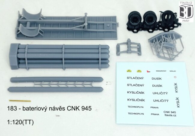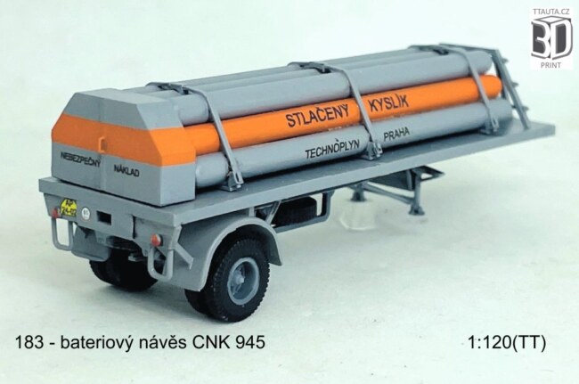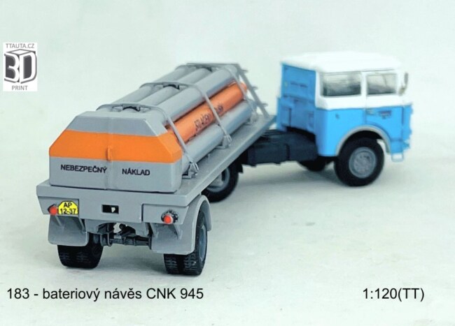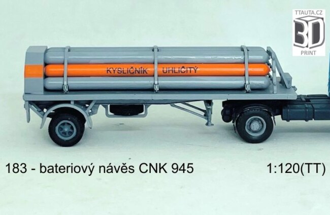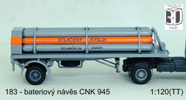 3D tiskem vyrobená stavebnice vozu návěsu pro přepravu plynů CNK 945. Obsahuje tisknuté díly, obtisk.
