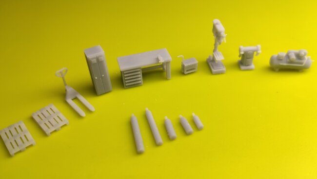 Jednoduchá stavebnice vnitřního vybavení dílny (palety, paletový vozík, ponk, vrtačka, bruska, skříňka, tlakové lahve…). Vyrobená 3D tiskem. Jedná se o již začištěný 3D výtisk. Stačí slepit díly k sobě, velmi jednoduchá stavebnice, zvládne i začátečník.