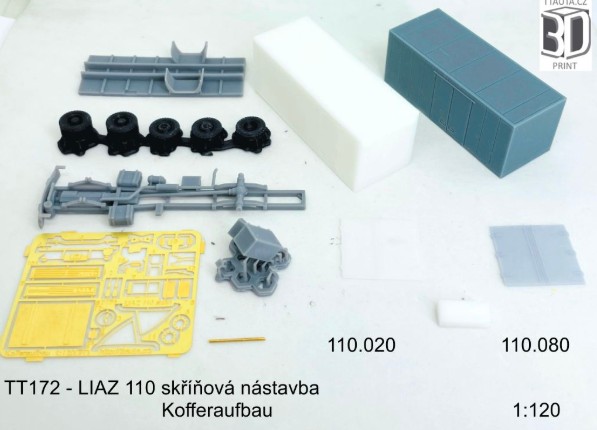 3D tiskem vyrobená stavebnice vozu Liaz 110.020 ve verzi čisté skříně (bez popisu). Obsahuje tisknuté díly, leptané doplňky a obtisk.