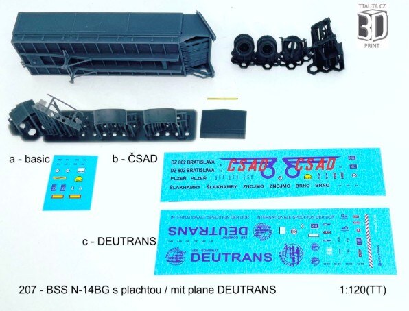 3D tiskem vyrobená stavebnice vozu návěsu s plachtou. Obsahuje tisknuté díly, obtisk. Obsahuje jen základní obtisky (SPZ).