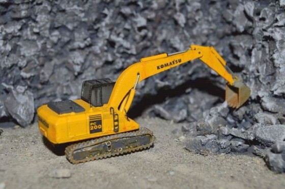 Stavebnice pásového rypadla Komatsu PC220. Odlité díly a leptané doplňky, kabina odlitá z čirého resinu.