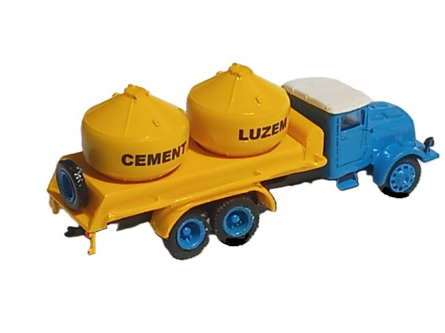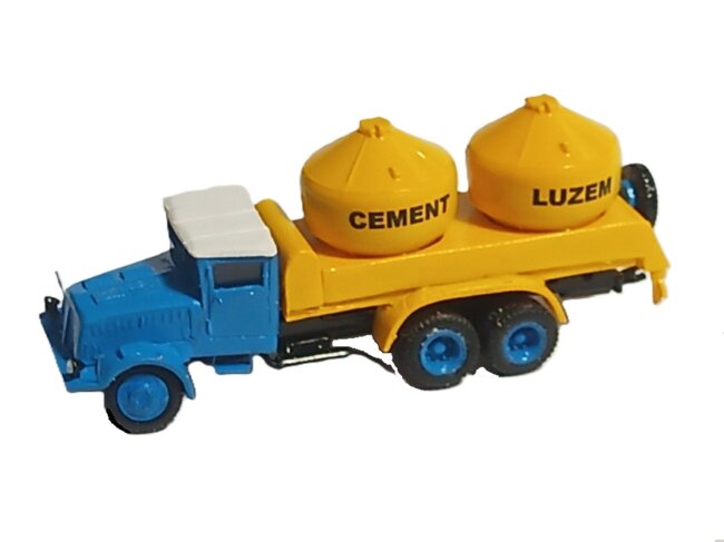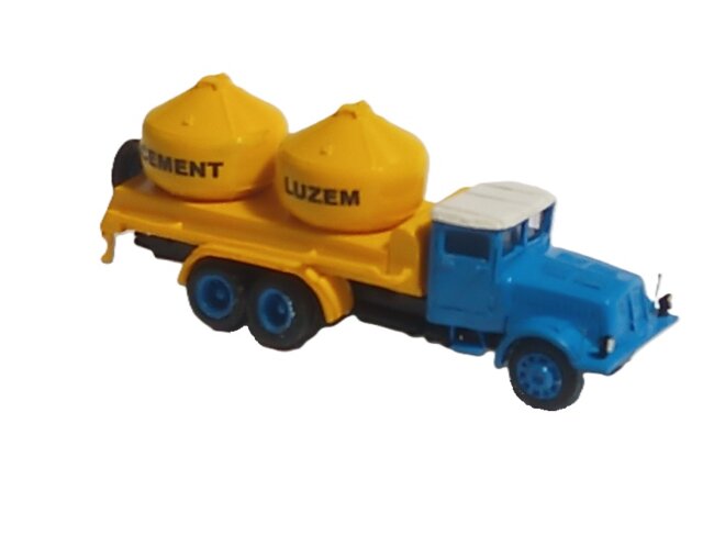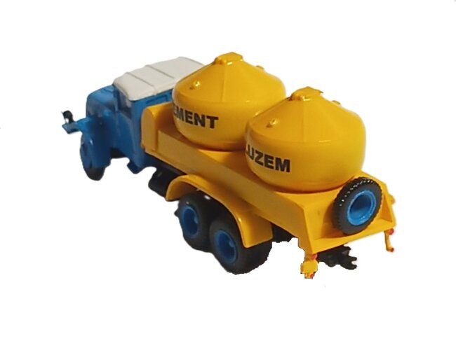 Polyuretanová stavebnice nákladního vozu T111 – přepravník cementu CW -8 (žluto modrý, výroba nástavby v PLR). Model lze postavit i s otevřenou kapotou motoru. Kvalita odlití dílů je špičková, odlité jsou i ty nejdrobnější díly velmi detailně.