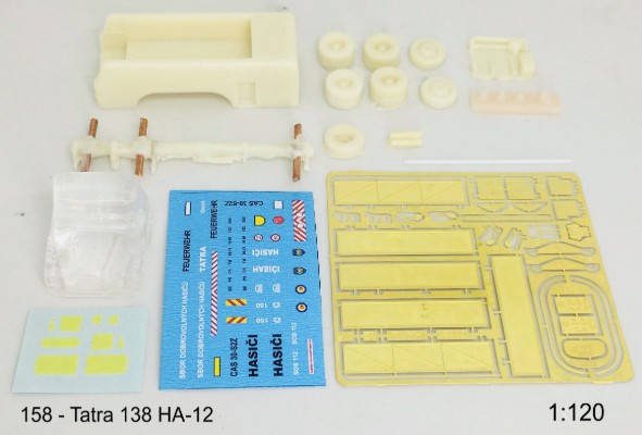 Polyuretanová stavebnice hadicového hasičského automobilu T138 HA-12. Obsahuje odlité díly, leptané doplňky a obtisk. Kabina odlitá.